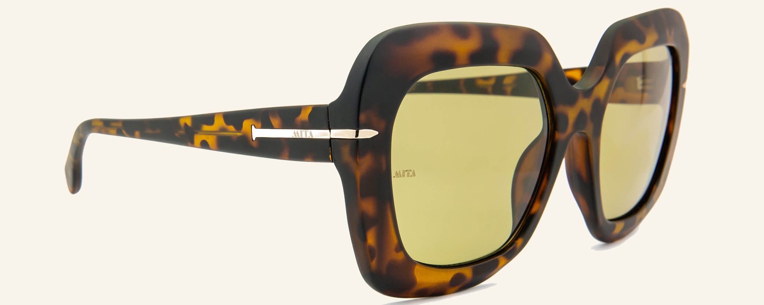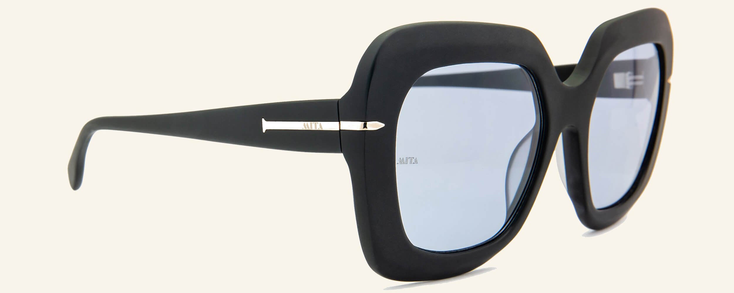GRANDE - Silueta cuadrada esculpida de gran tamaño, realzada con el icónico detalle de metal envolvente de MITA. Este modelo está hecho de botellas de agua recicladas aprobadas por la FDA, llamadas RPET, y esmaltadas con lentes solares sostenibles. Este modelo es RxAble.